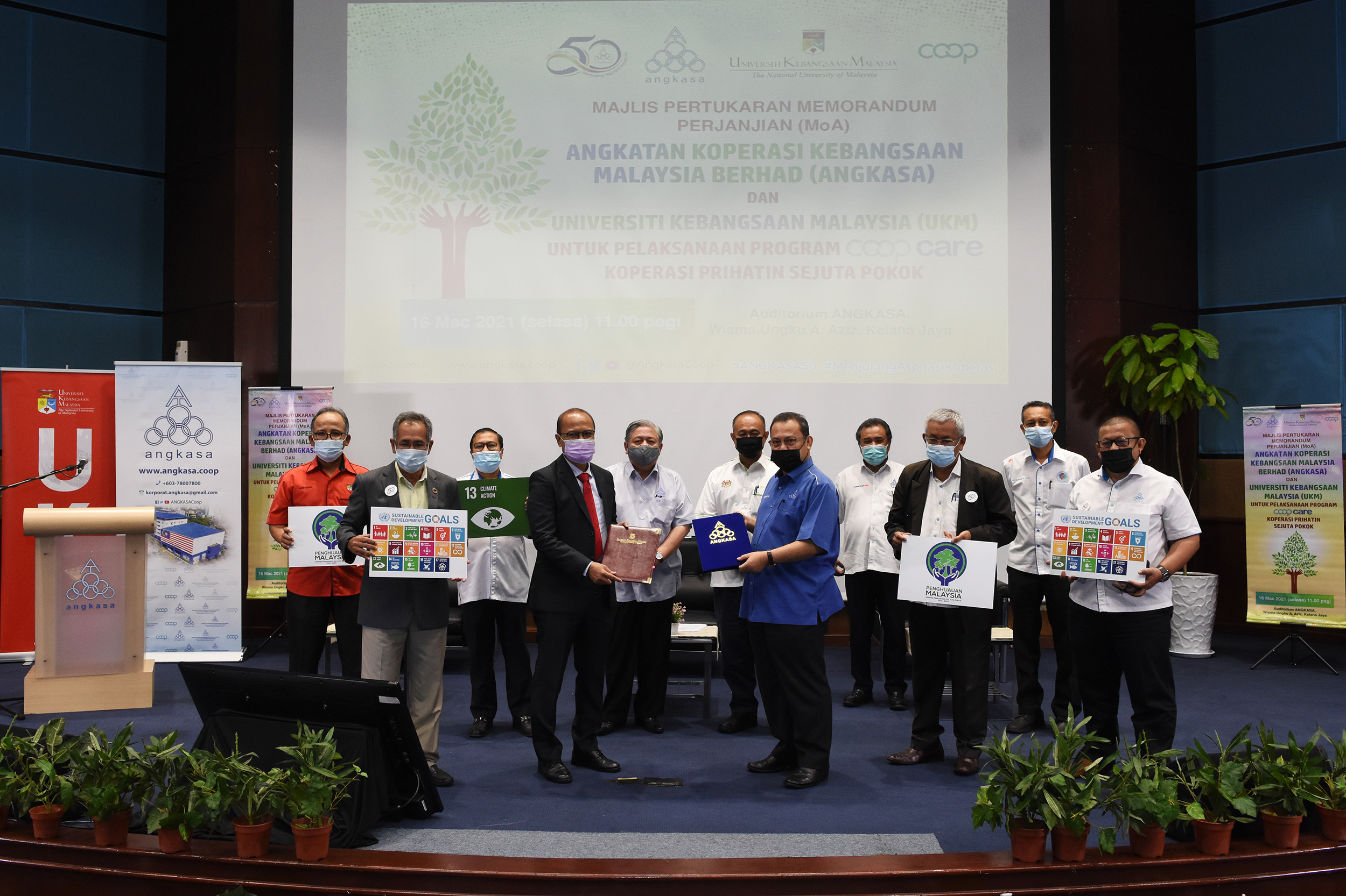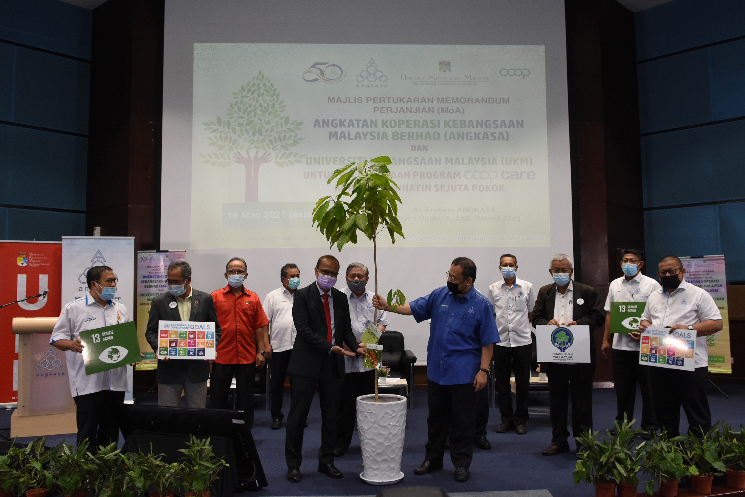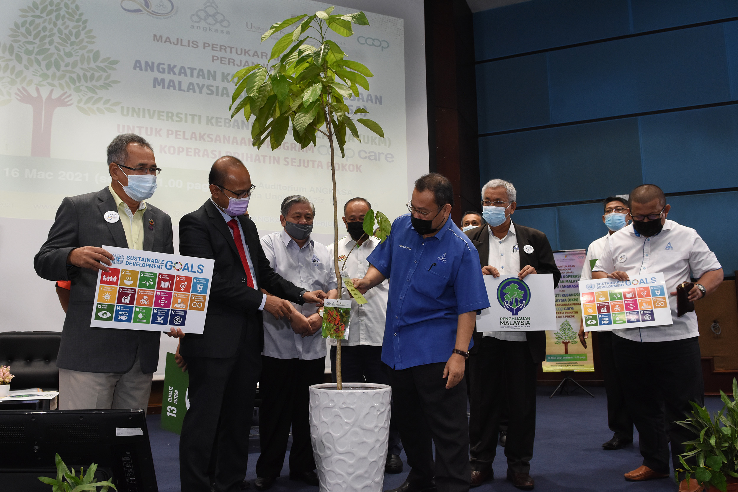 ANGKASA komited menjayakan agenda kerajaan untuk menanam 100 juta pokok menjelang tahun 2025 sebagai salah satu usaha bagi membantu menangani pemanasan global dan perubahan iklim. Dalam usaha bagi menggerakkan program tersebut, ANGKASA menjalinkan kerjasama dengan Universiti Kebangsaan Malaysia (UKM) untuk menjayakan Program CSR CoopCare Koperasi Prihatin Sejuta Pokok. Pelaksanaan program tersebut, yang menjadi antara simbolik sambutan ulang tahun ANGKASA yang ke-50 pada tahun ini membuktikan kesediaan ANGKASA untuk meneraju dan memenuhi Matlamat Pembangunan Lestari (SDG) 2030.